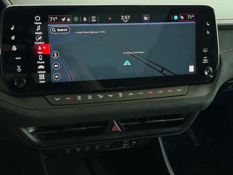 Key features include Android Auto and Apple CarPlay for seamless smartphone integration, built-in Navigation for easy route guidance, Hands-Free Bluetooth for safer calling, and Adaptive Cruise Control for relaxed highway driving. The Scat Pack Plus trim upgrades comfort and convenience with refined interior appointments and driver-focused amenities.